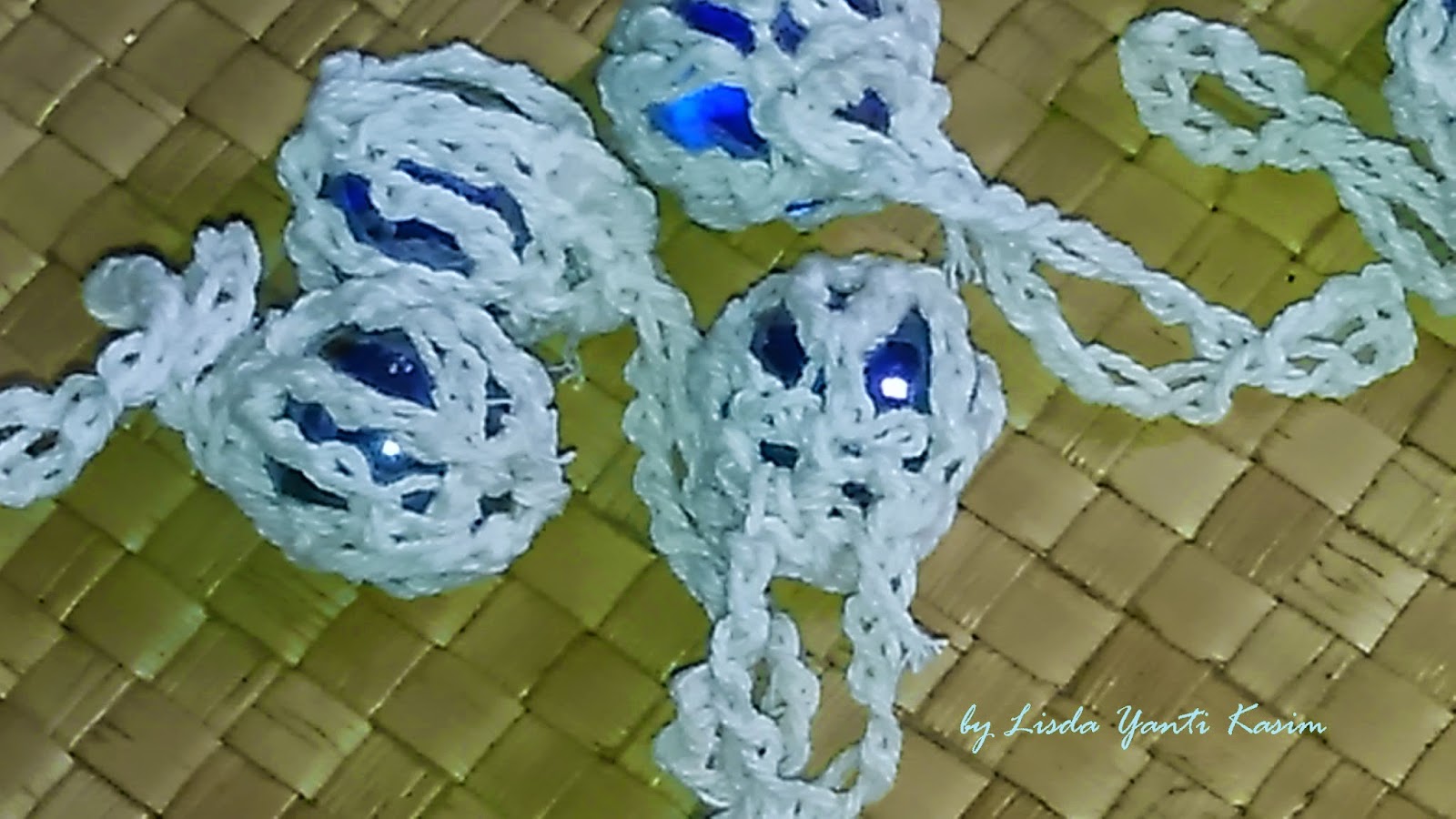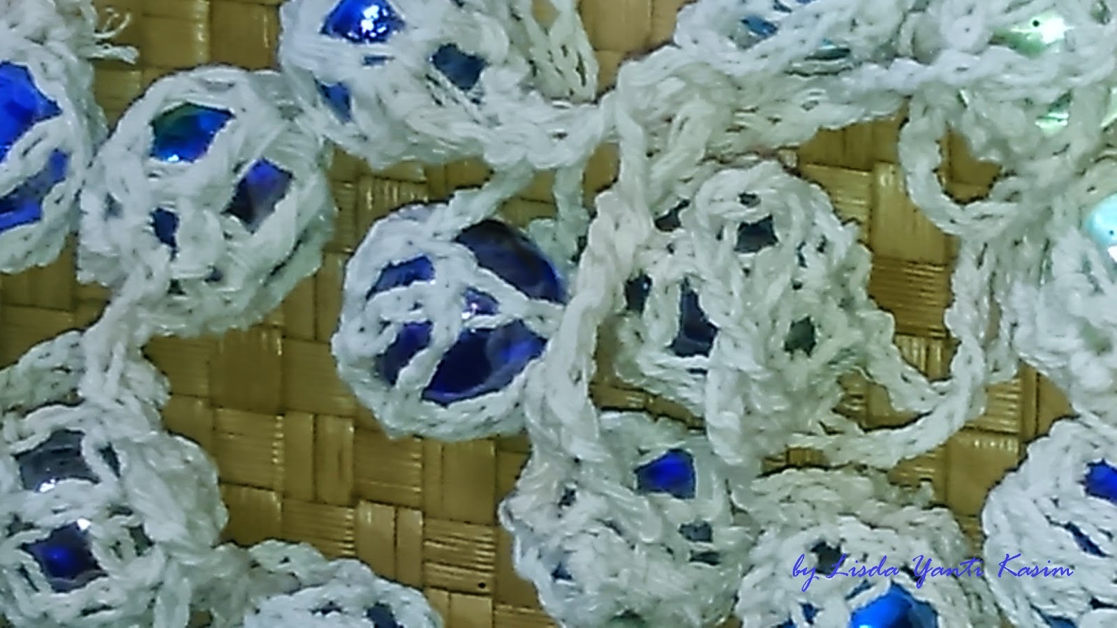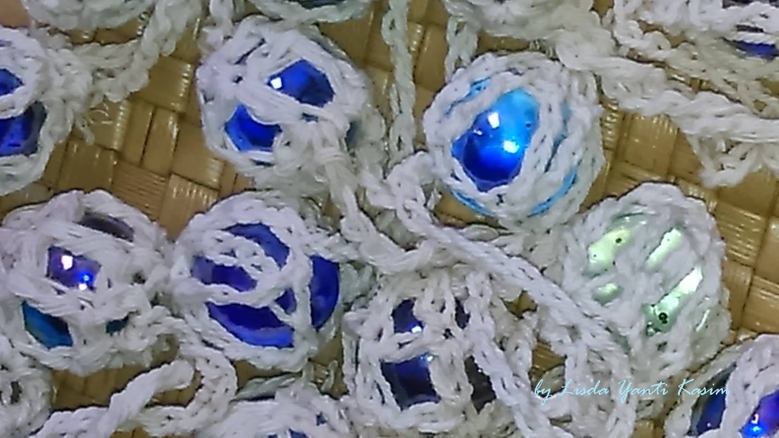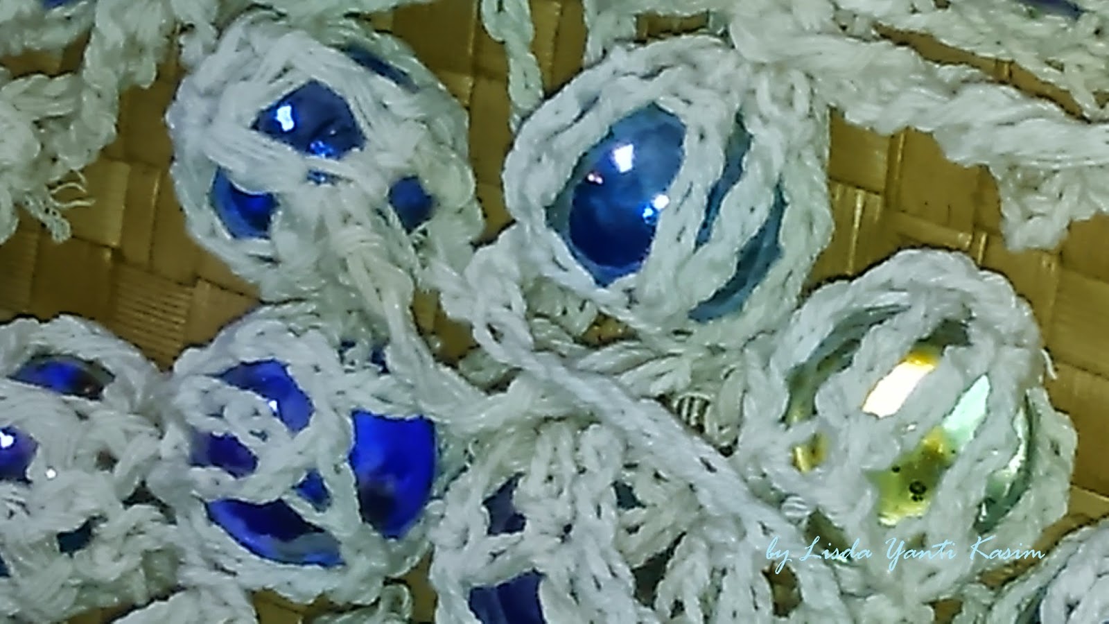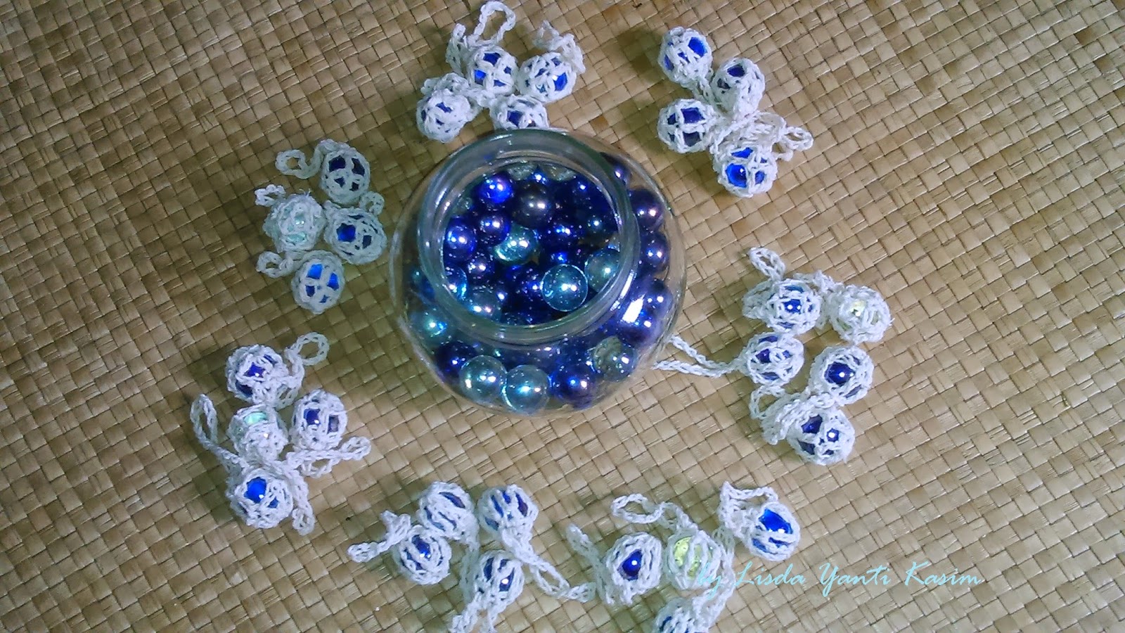 I found some nice clear blue marbles and then I wrap them by crochet so I can hang them at the edge of ponchos.